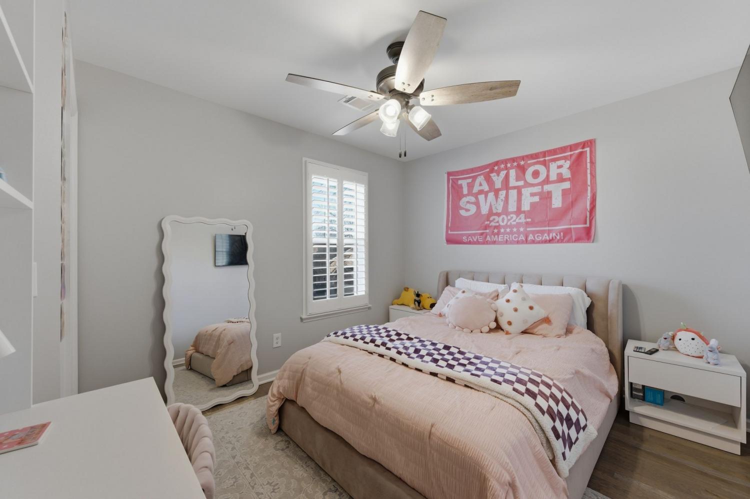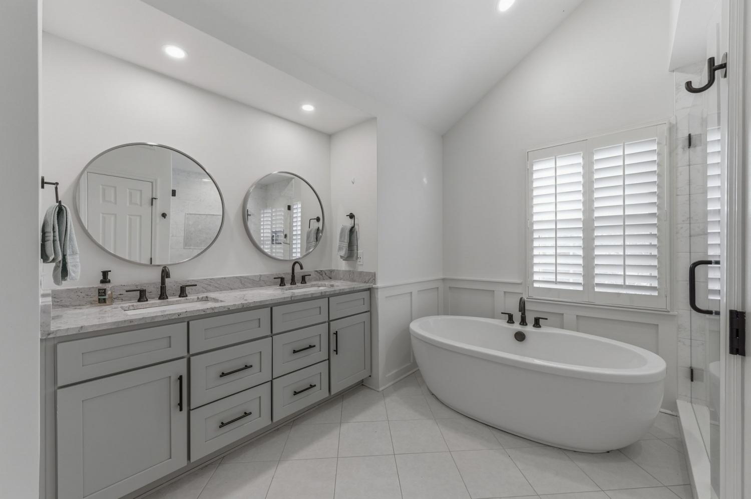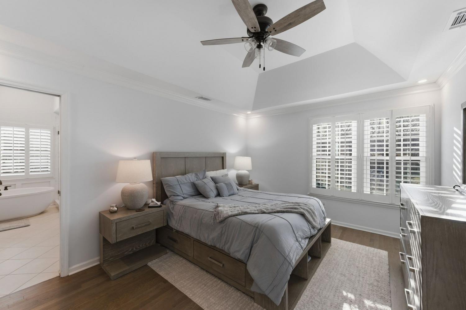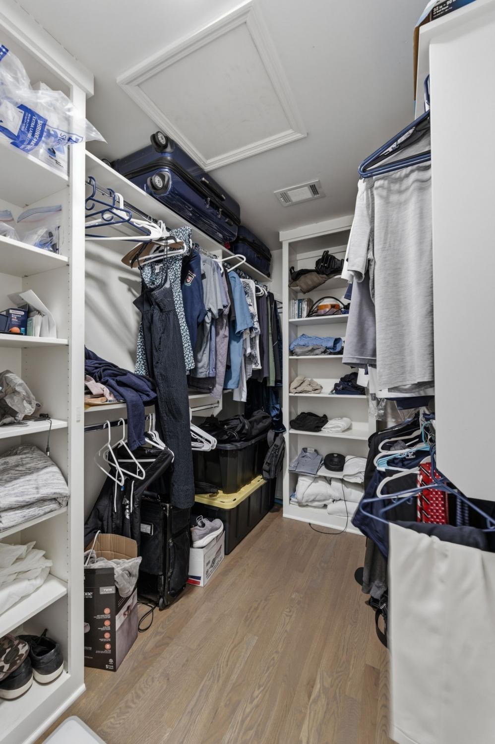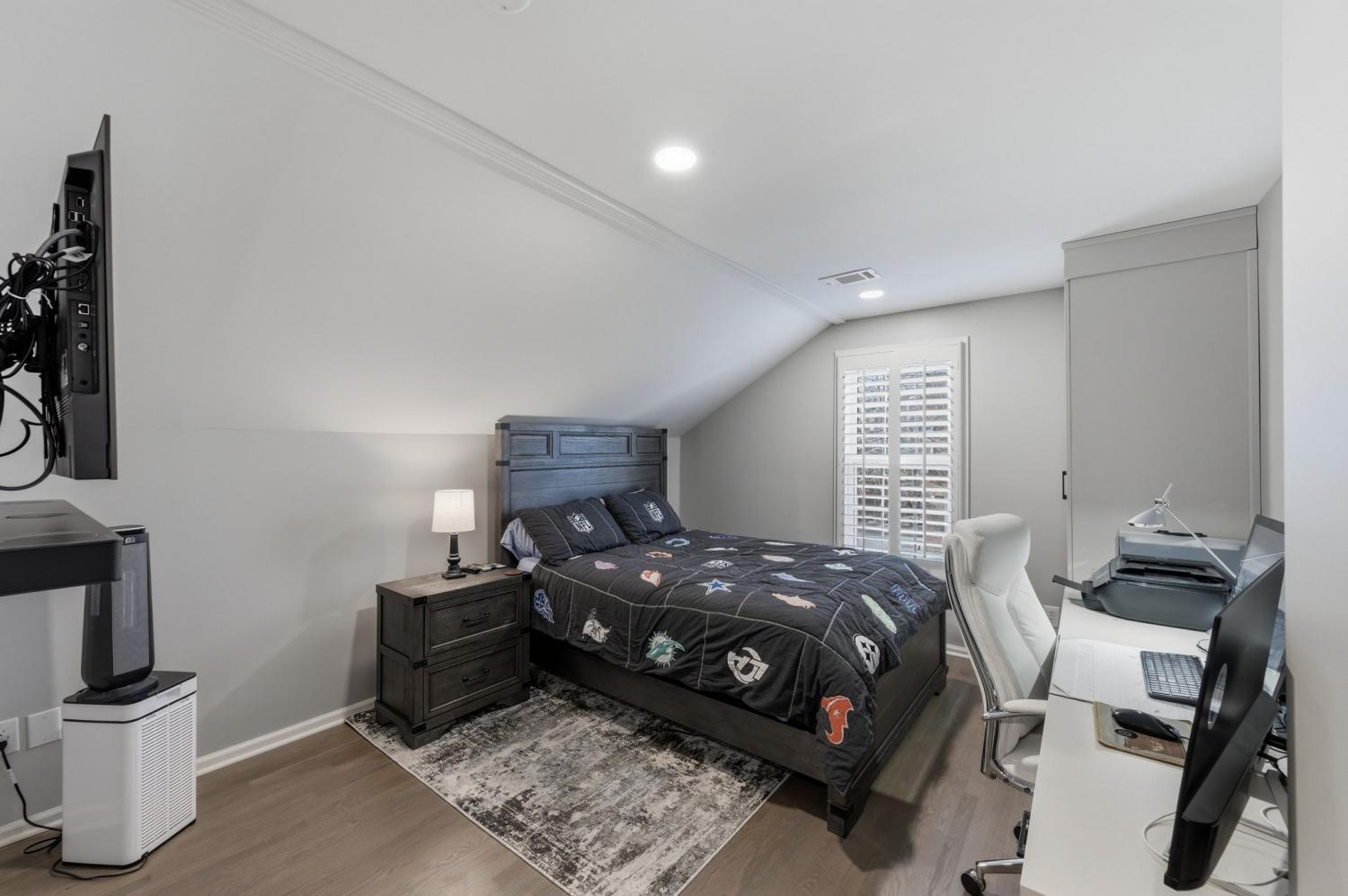 Upstairs, the original primary suite has been completely renovated with an updated bath and closet, along with spacious secondary bedrooms. The upstairs hall bath has been fully renovated, and an additional fourth bath was added upstairs to create another en-suite bedroom, offering exceptional flexibility for guests or family. California Closets–designed systems are featured in the upstairs bedrooms, including built-in desks in two rooms.