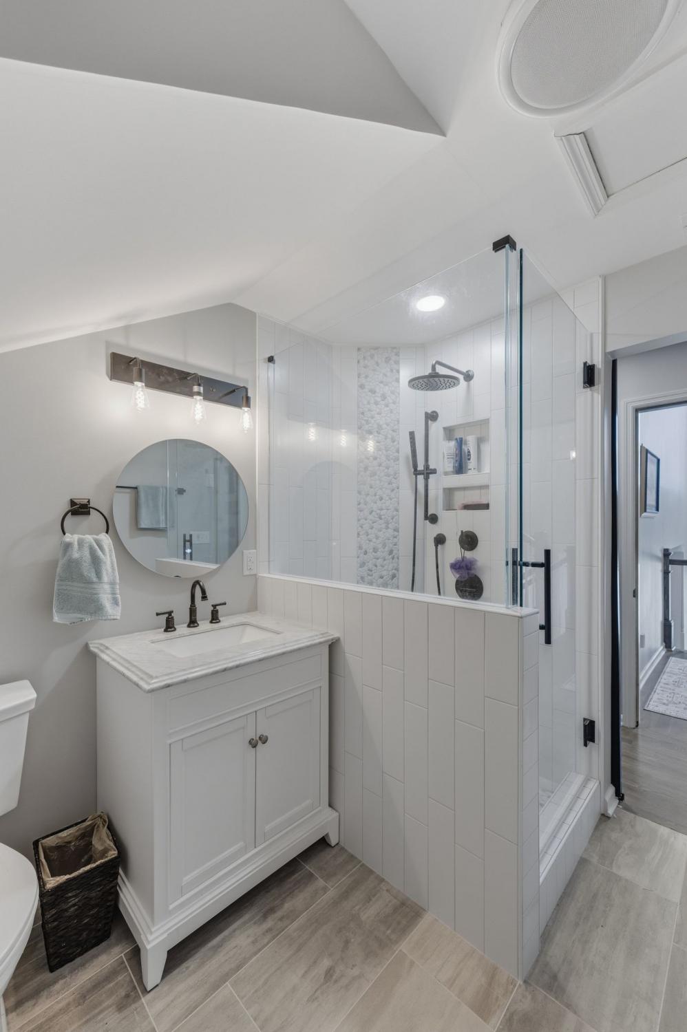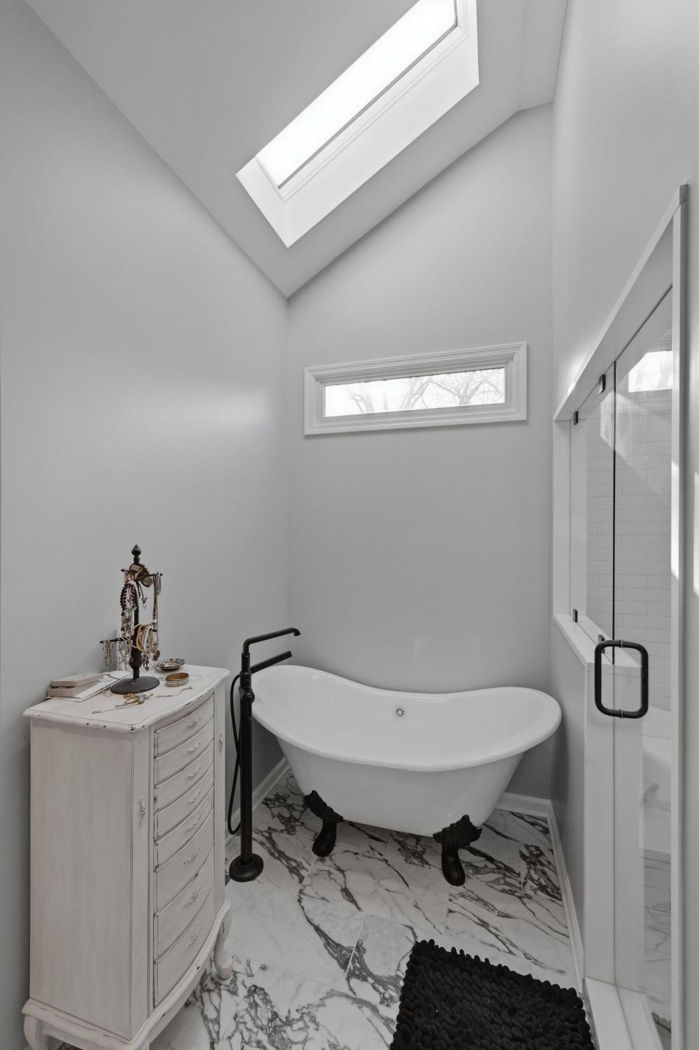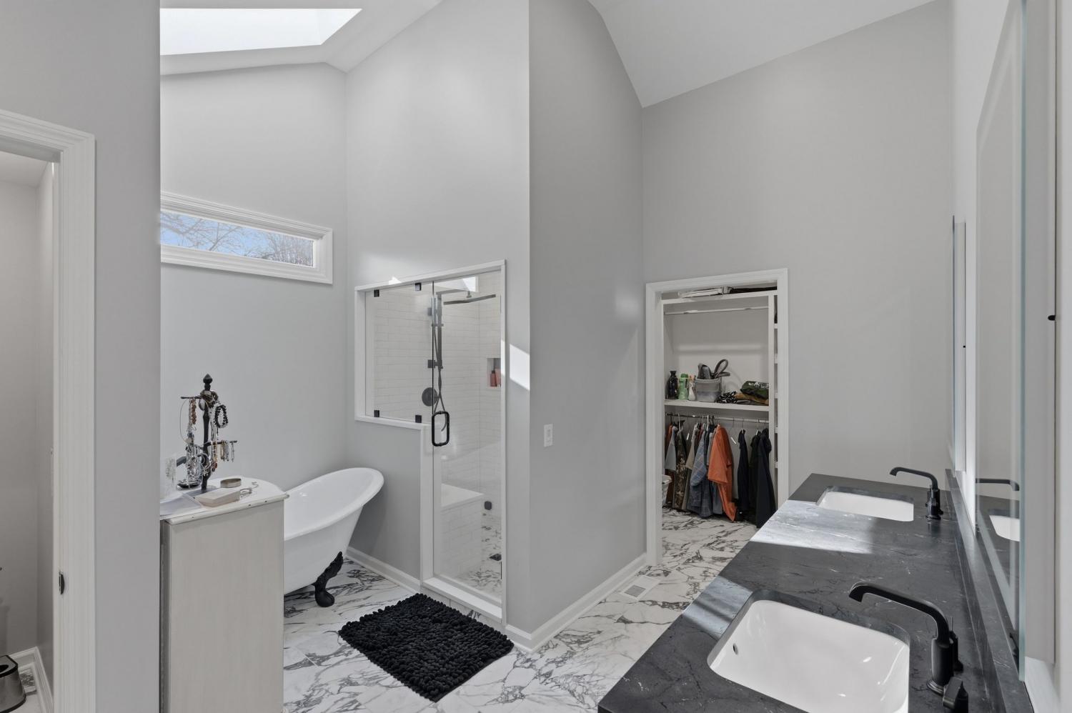 A stunning newly added owner’s suite on the main level features a spa-inspired bath with heated tile floors, a luxurious shower with dual rain shower heads, steam capability, and a Bluetooth exhaust fan so you can enjoy your favorite music while you unwind. A skylight over the tub fills the space with natural light, and the spacious owner’s closet includes a convenient washer/dryer hookup.