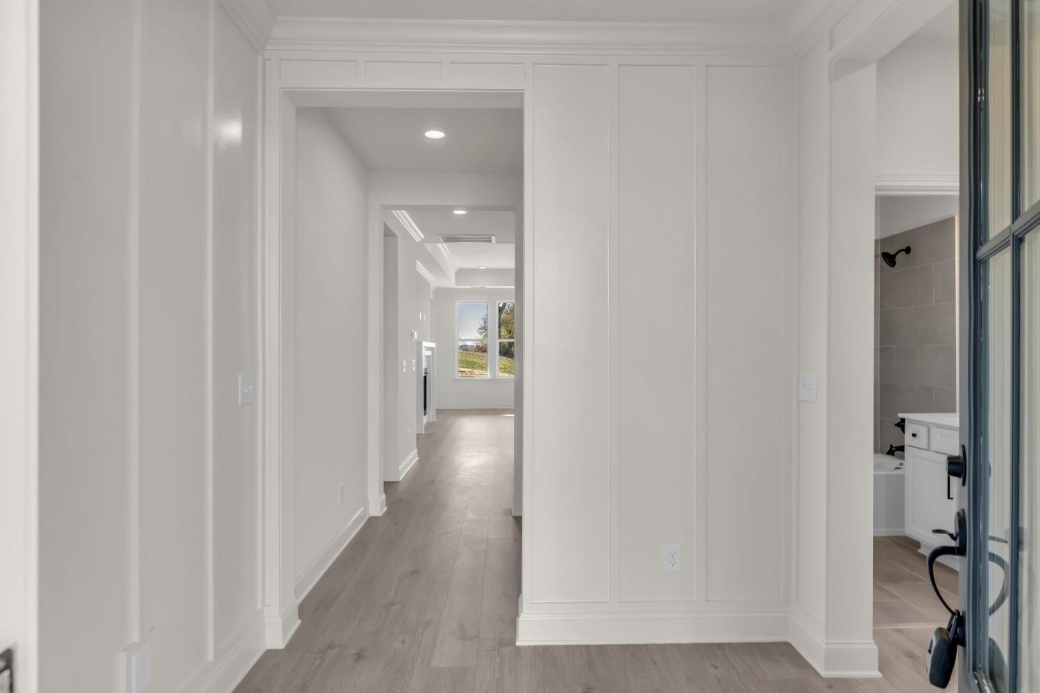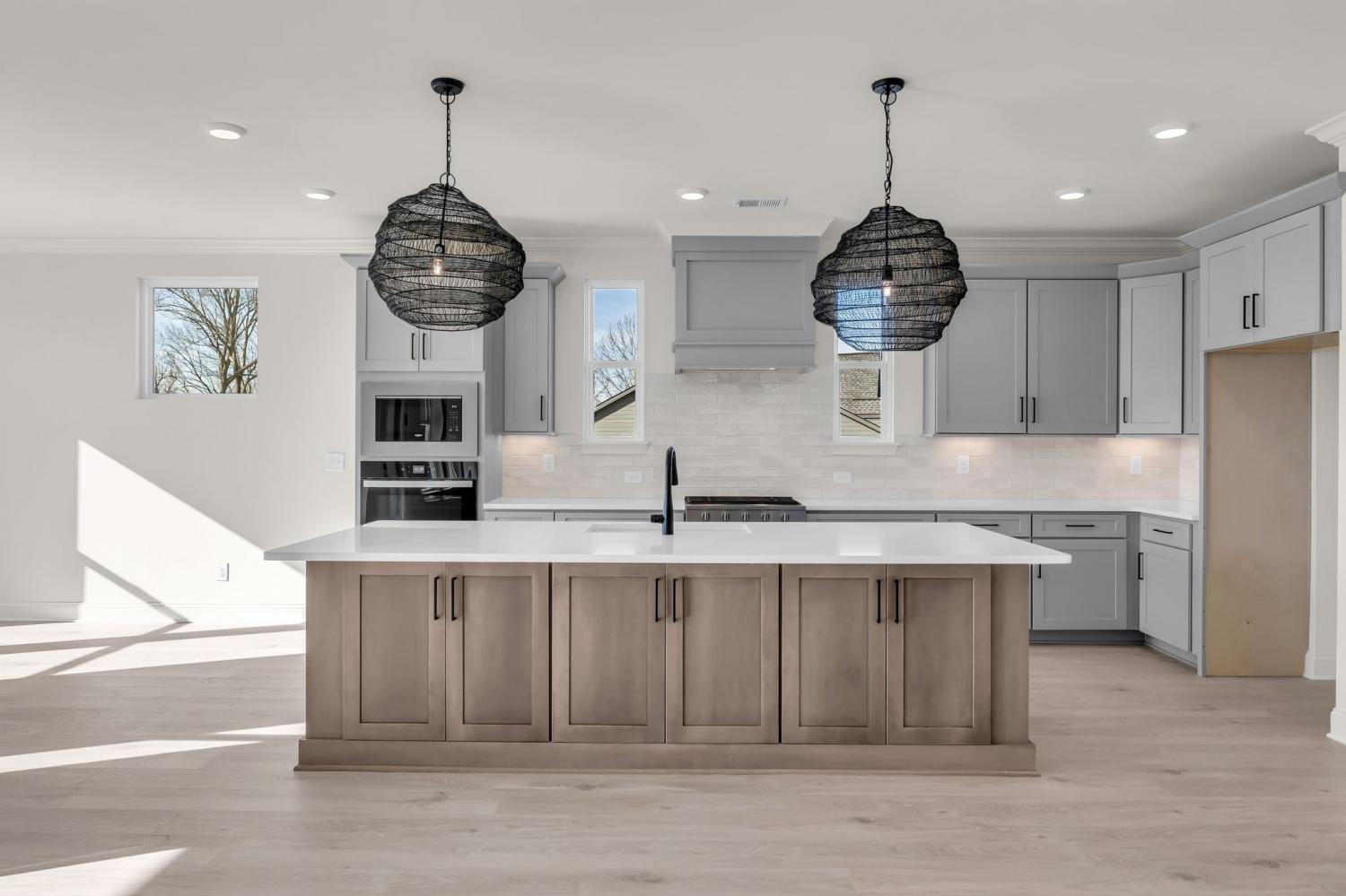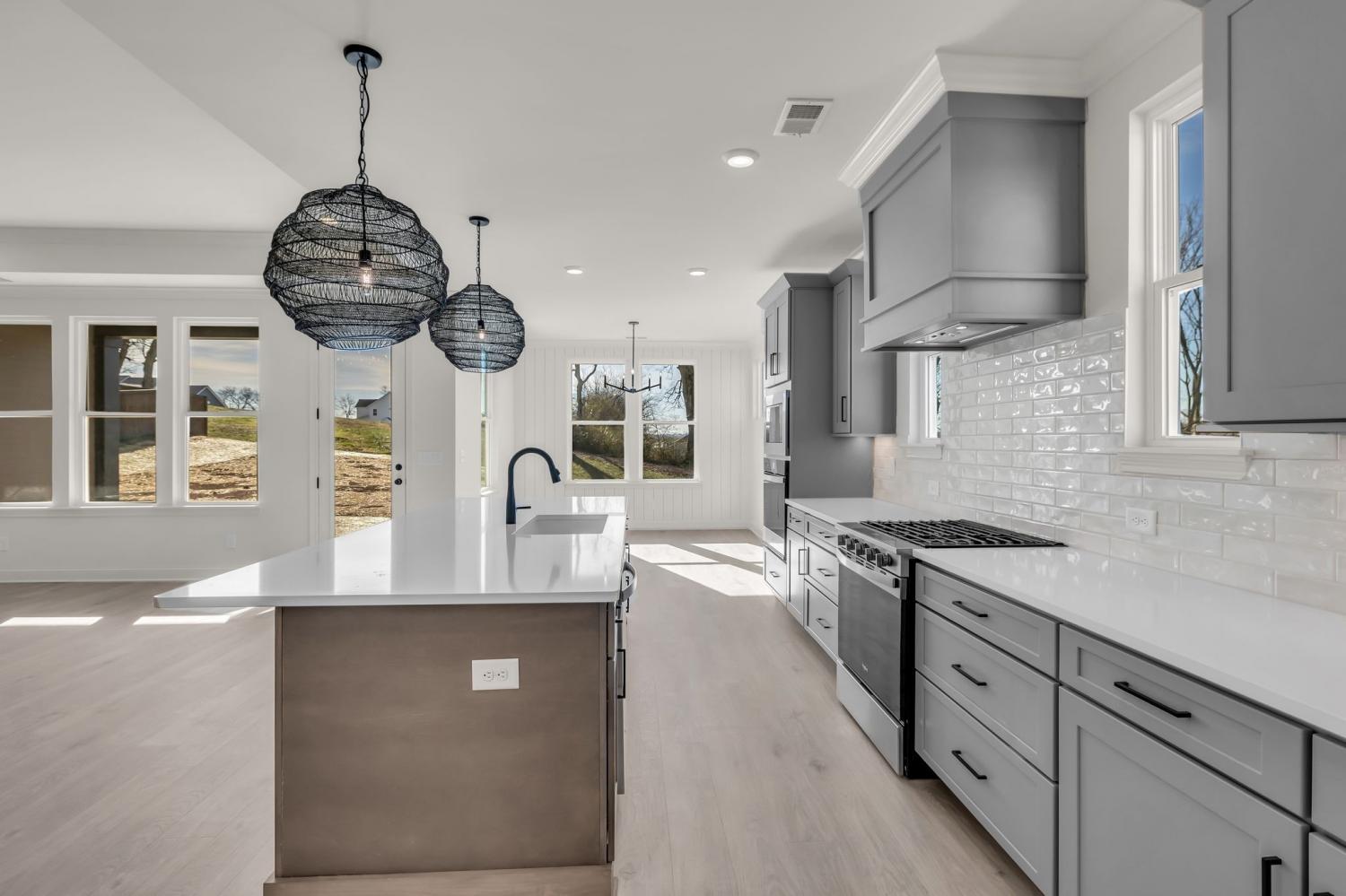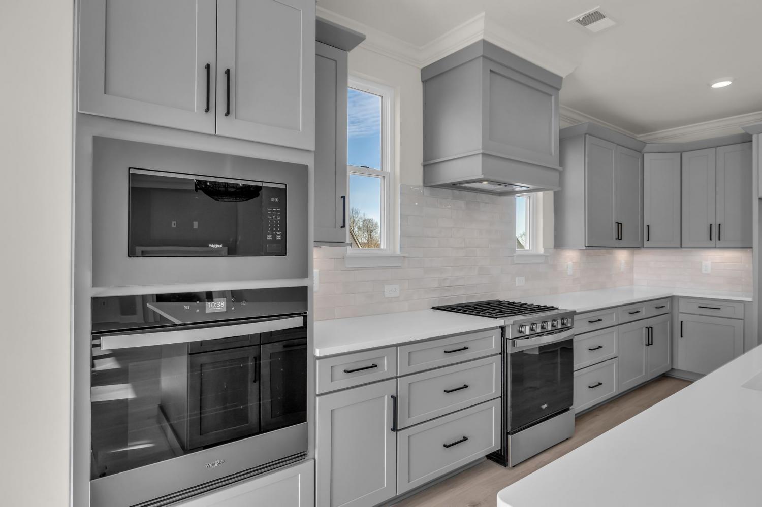 The gourmet kitchen is a true showstopper, featuring an oversized island, abundant cabinetry, and a spacious pantry. Premium upgrades include a cabinet-grade vent hood, backless gas range, and Whirlpool stainless steel appliances, all thoughtfully selected for both beauty and performance.