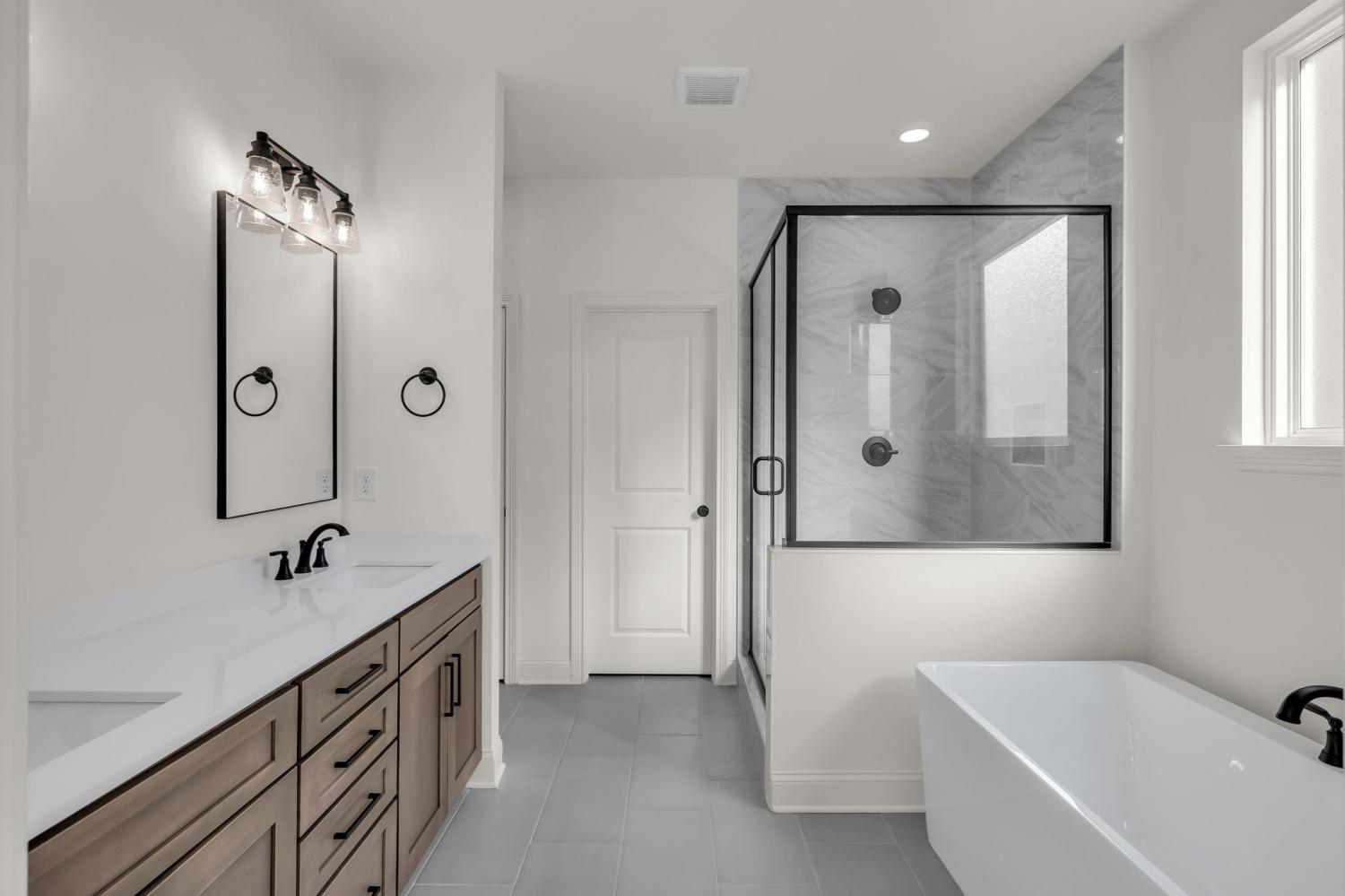 The main-level Primary Suite offers a serene retreat with a luxurious Owner’s Bath showcasing a freestanding soaking tub and a fully tiled walk-in shower with upgraded tile and plumbing finishes. An additional bedroom and full bath on the main level provide excellent privacy for guests or multi-generational living. A versatile flex room on the first floor is ideal for a home office, study, or fitness space.